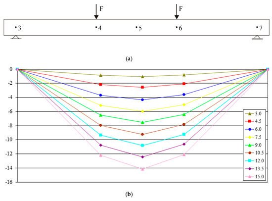 The measurements of the displacements of selected beam characteristic points were performed in a dozen or so stages of loading (determined by the support reaction reading). The number of stages was selected on the basis of calculated beam load bearing capacity and conditioned upon their longitudinal reinforcement ratio. Displacement values were measured in each of the analyzed loading stages. Deflection was calculated in reference to supports’ vertical movement. Examples of B-1 beam graphs are given in Figure 4. The deflections obtained for each of the tested beams at the force application points (Points 4 and 6) differed insignificantly at all load stages. The maximum mean percentage error obtained for all analyzed beams was 5.8% (for the J-1 beam). These were small differences, which may have originated from small measurable values, particularly at the preliminary load stages. The differences for deflections in mid-span of beams of the same series, in particular load stages, gave an average error not exceeding 15% (with the exception of Series I beams). The average deflection value obtained for two beams of each series was used here for further analysis purposes.