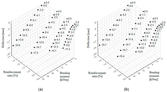 Relationship between the reinforcement ratio, bending moment, and deflection of fine aggregate and concrete beams with fibers: (a) 50/0.8 mm; (b) 30/0.55 mm.