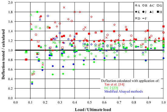 Figure 7 illustrates a comparison of the measured and calculated values of maximum deflections in subsequent load stages for all tested beams. The Tan et al. [14] and EC 2 [22] methods, as well as the authors’ modification of the Alsayed calculation method were used consistently in the calculations. It appears from Figure 5 that deflection values determined through the application of the Tan et al. [14] method were considerably lower than the measured values. This was probably caused by the fact that the proposed deflection determination method pertained to the steel fiber reinforced concrete beams and not the steel fiber fine aggregate concrete members. The Eurocode 2 method (for plain concrete) [22] gave deflection values that differed insignificantly from the test results. A similar situation pertained to the modified Alsayed method, for which the results were also close to the measured ones. A more accurate analysis of the presented results was accomplished for the operational loads, which are most important for civil engineering practice (Table 5).