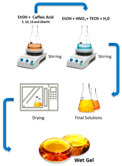 The organic counterpart of the hybrid materials was the phenolic compound caffeic acid (Sigma-Aldrich, Milan, Italy), dissolved in ethanol and then added dropwise to the synthesized silica sol under stirring. The stirrer was stopped after 20 min and, after gelation at room temperature, the products were air-dried at 40 °C for 24 h to remove the residual solvent, without compromising the thermal stability of the embedded phenol. The amount of caffeic acid varied from 5 to 20 wt.% (Figure 1).