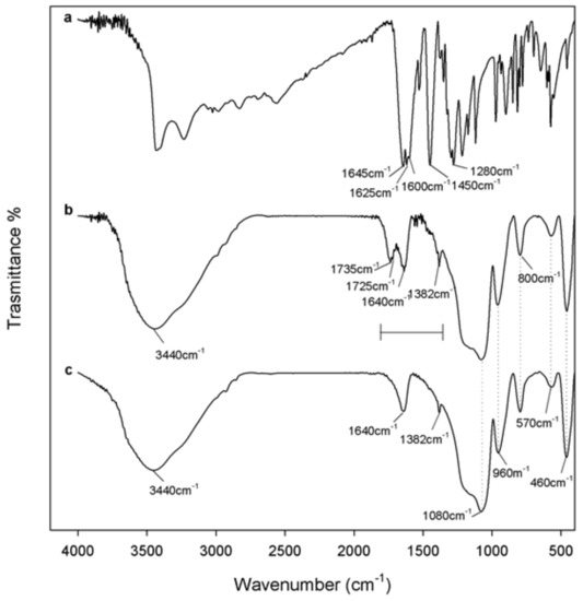 On the other hand, Figure 2c shows the FT-IR spectrum of pure SiO2, with the typical signals already described elsewhere [27,28]. Briefly, the broad, intense band at 3440 cm−1 was due to O–H stretching modes of water, whereas the bending mode was detected at 1640 cm−1. Hydrogen-bonded water molecules and hydrogen-bonded OH groups attached to the Si atoms were expected to occur. Symmetric and asymmetric Si–O stretching vibrations were identified at 1200 and 1080 cm−1, while Si–O–Si bending mode frequencies were at 800 cm−1 and 460 cm−1. Moreover, according to the literature, peaks at 1382, 960, and 570 cm−1 were due to residual nitrate anions resulting from HNO3 used as a catalyst in the synthesis procedure, as well as Si–OH bond vibrations and four-membered siloxane cycles in the silica network [18,29,30].