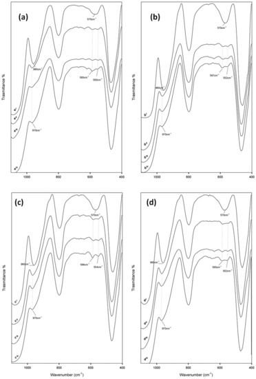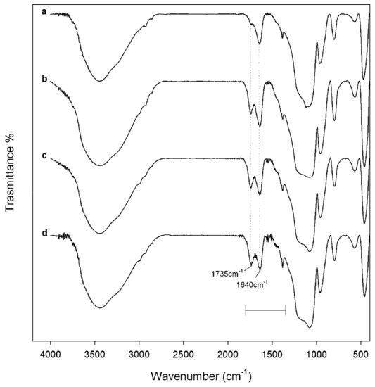 Fourier-transform infrared (FT-IR) transmittance spectra were recorded in the 400–4000 cm−1 region using a Prestige 21 (Shimadzu, Tokyo, Japan) system, equipped with a deuterated triglycine sulfate (DTGS) detector with potassium bromide windows, with a resolution of 4 cm−1 (45 scans). The FT-IR spectra were processed by Prestige software (IR solution, version 1.50, Shimadzu, Tokyo, Japan). A Specac manual hydraulic press (Orpington, UK), equipped by a cylindrical holder, was used to press sample powders (200 mg, 1 wt.% in KBr) until a disc (13 mm diameter, 2 mm thickness) was obtained.