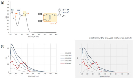 UV–Vis spectroscopy seemed to confirm the hypothesis of a strong connection between caffeic acid and the silica matrix. As for the FT-IR spectra, in this case, the comparison of material spectra with pure inorganic and pure organic constituents dissolved in EtOH was also useful. In Figure 4a, the UV spectrum of the phenol compound was reported. Briefly, it is mainly characterized by four absorption bands at 324, 296, 242, and 216 nm. The n→π* and π→π* electronic transitions referring to the C=O group were responsible for the absorption at 296 and 216 nm, respectively, whereas the bands at 242 and 324 were attributable to the π→π* transitions of the aromatic moiety [25]. At the considered caffeic acid concentration (3.5 × 10−5 mol∙L−1) the band at the lowest wavelength was the most intense. It was previously reported that the shifts of maximum absorbance, intensity variation, and isosbestic points are due to the self-association of caffeic acid through hydrogen bonding of carboxylic groups, which lead to the formation of a dimeric structure [31].