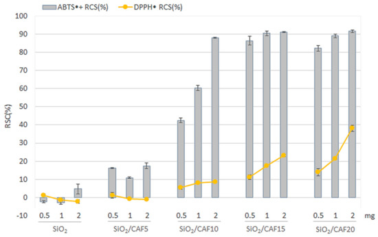 As depicted in Figure 6, pure SiO2 proved to be completely ineffective on both targets. Thus, the activity of hybrids could be completely ascribed to the presence of the phenol compound embedded in the silica matrix, and it is worth noting that an increase in the caffeic acid wt.% led to an increment in the antiradical capacity. Moreover, the radical scavenging capacity of hybrids was also directly correlated to the materials’ tested dose (ranging from 0.5 to 2 mg), put in direct contact with the reaction mixture. In the ABTS assay, this was particularly evident for SiO2/CAF10, whereas, for SiO2/CAF15 and SiO2/CAF20 samples, a plateau was reached at a radical scavenging capacity (RSC) of about 90%.