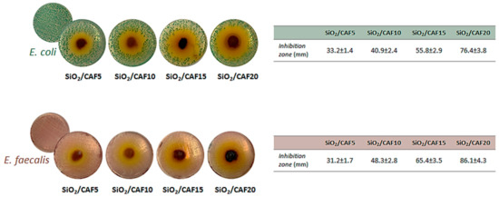 The Gram-negative Escherichia coli and Gram-positive Enterococcus faecalis were used as representative bacteria to investigate antibacterial properties of the synthesized materials. To this purpose, the microbial growth was evaluated by observing the inhibition halo diameter after inoculation with 100 mg of the hybrid powders. In Figure 7, pictures of the bacterial cell suspension are reported, as well as the measured values of inhibition zones. Based on the obtained results, both bacteria seemed to be sensitive to the presence of the hybrids, with the Gram-positive bacteria slightly more responsible. The halo’s size was directly related to the amount of caffeic acid embedded in the materials, reaching maximum values of 76.4 ± 3.8 and 86.1 ± 4.3 mm for SiO2/caffeic acid 20 wt.% vs. E. coli and E. faecalis, respectively. It is worth noting that the activity augumented with the increase in the caffeic acid weight percentage in the synthetized hybrids, highlighting, according to previous findings, that SiO2 did not exert an antibacterial effect [35].