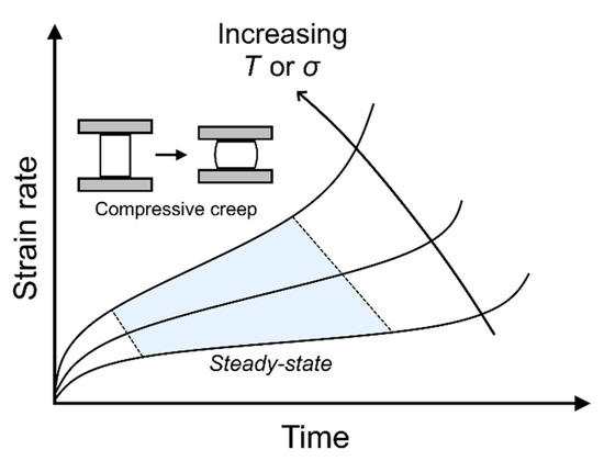 Creep is the continuous deformation of a material subjected to a constant load or stress, often lower than its yield strength. It is a process that is very sensitive to temperature, generally considered as high-temperature deformation, which occurs at roughly ≥ 0.5 T/Tm (where T/Tm in K is the homologous temperature) [1]. It is an imperative issue, which could lead to failure of engineering materials that are under stress and exposed to high-temperature environments. Compressive creep tests are a convenient method for investigating high-temperature deformation, especially for strong and brittle refractory materials such as ceramics [2,3,4]. Creep generally includes three different stages: the primary, secondary and tertiary stage (Figure 1). The primary and tertiary are the initial and final stages, in which there is a transient strain rate that decelerates to a steady rate or accelerates up to failure by rupture, respectively. Meanwhile, during the second stage, termed steady-state creep the strain rate is constant (or nearly constant). The creep rate in this stage is used to evaluate high-temperature deformation and creep behavior of materials.