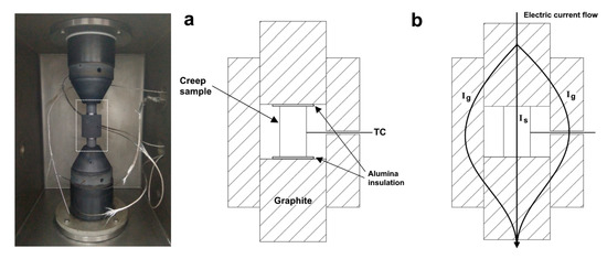 The temperature in the SPS apparatus is typically measured using the built-in system pyrometer or thermocouples. For the best accuracy during creep tests, it was suggested to place a thermocouple (C, K or S type for our system) in direct contact with the sample surface (see Figure 2). Temperature distribution in SPS is a known issue which also depends on the tooling configuration [19,20]. If there is only resistive heating of the sample during creep tests of conducting materials (i.e., tooling without a surrounding die as was used in our previous studies [14,15]) the temperature deviations may be relatively large due to significant heat loss from the sample surface. To mitigate this, it is suggested in the present study to apply an electric current while using the graphite die, like the configuration discussed in [21]. The minor disadvantage in this case is that the electric current value applied by the SPS apparatus splits between the die and sample. The actual current applied to the sample (Is) can then only be estimated according to the relative electrical resistance of the tooling and the sample according to the Kirchhoff’s law. Thus, the different heating configurations for SPS apparatus creep tests are as depicted in Figure 2. In which conductive materials can be resistively heated by passage of an electric current as well as by heat convection and radiation from the graphite punches and die, respectively. The electric current can be avoided by separating the sample from the graphite by the means of a ceramic insulator, such as alumina. When tests are conducted at relatively high temperatures a graphite felt should be placed around the die to further mitigate heat dissipation.