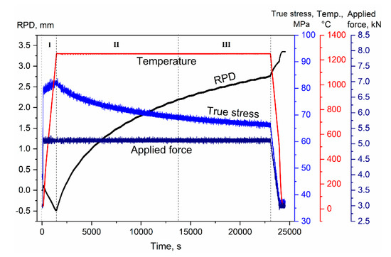 The creep test itself is performed in a relatively simple manner, by setting the designated temperature and load (pressure is calculated according to sample cross-section) and tracking RPD. The test can be conducted under constant temperature or load, but also with various pressure or temperature steps [15], to obtain multiple creep rate measurements from a single sample. An example for a testing procedure of alumina (at 1250 °C under 80 MPa), including all relevant experimental data necessary for creep evaluation, is presented in Figure 4. The heating stage I (Figure 4), is conducted prior to the creep test, while a minimal or designated test force is applied. At this stage, the negative RPD indicates the thermal expansion of the graphite tooling system and stainless-steel pistons. In segments II–III (Figure 4), the recorded displacement reflects only sample deformation after a mechanical and thermal equilibrium have been reached. In segment II there is a rapid decrease in the strain rate, while in segment III the strain rate is practically constant. Thus, segments II–III are considered primary and steady-state creep, respectively. It should be noted that the steady-state mentioned above (segment III) is sometimes a quasi-steady-state, due to the continuous reduction of true stress during creep (Figure 4) as well as concurrent grain growth [23,24]. This would be more of an issue at high strain rates under testing conditions of relatively high temperatures or applied stress [12].