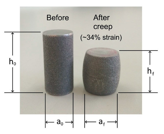 Example of AlSi10Mg samples before and after creep test (~34% strain) at 225 °C under an initial applied pressure of 130 MPa.