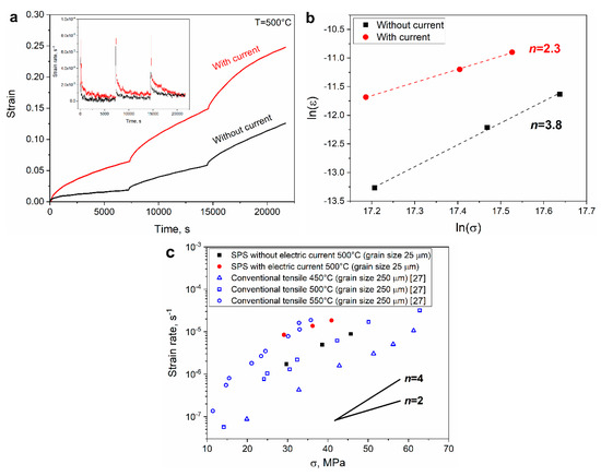 Therefore, in the present study, we performed additional creep experiments on similar copper samples with a surrounding die, which allows to lower the temperature gradient. These isothermal creep tests were conducted with load increments of 30, 40 and 50 N, while maintaining a constant temperature of 500 °C. This makes it possible to investigate the stress dependence and determine the stress exponent n. Each of these tests was performed in both possible configurations, with and without an electric current. The obtained creep curves are presented in Figure 6a, and the calculated creep rates are presented as a function of stress in Figure 6b. It was found that the value of n without the current was close to 4 which agrees with the known values for stress exponent of copper at relatively low stress (<100 MPa) and intermediate homologues temperatures [27]. While the value with the applied current was significantly lower, at around 2.3 (which is very low for copper). It has to be pointed out that stress exponent does not depend a relatively small temperature difference. See for instance a comparison with reported data for copper creep (tensile) at various temperatures (Figure 6c). Thus, the considerable difference of in the stress exponent could only be attributed to some electro-plastic effect which may affect the creep mechanism. Nevertheless, it is quite difficult to de-couple between the additional heating and electro-plastic effect, but the latter clearly has a contribution to susceptibility to creep [28,29]. Such results help to explain enhanced densification during SPS of conducting materials under influence of an electric current [16]. It perhaps may be possible to gain a deeper understanding on the matter by performing creep tests with different electric currents by altering the SPS tooling [30].