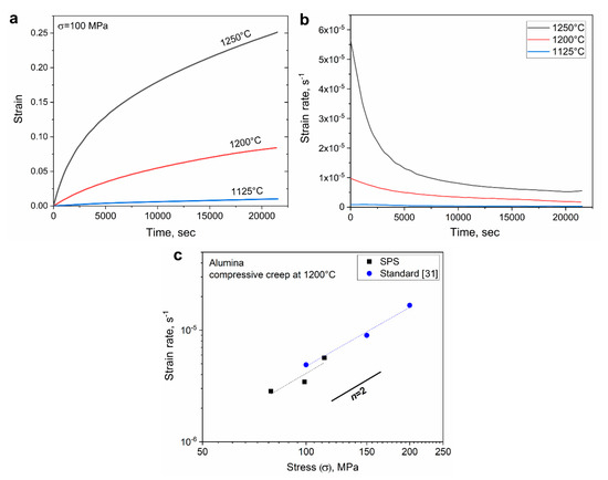 (a) Example of alumina creep tests strain under an applied stress of 100 MPa at the 1125–1250 °C temperature range and (b) corresponding strain rates; (c) comparison of creep rates (at 1200 °C and varying stress) measured for alumina by an SPS apparatus in compression (black squares) and conventional compression testing equipment [31] (blue circles).