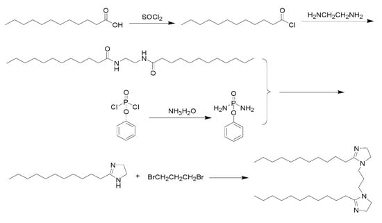 In this study, a new imidazoline inhibitor with a symmetrical molecular structure and containing two imidazoline heterocycles and two alkyl long chains of lauric acid was synthesized. The synthetic route is presented in Figure 1.