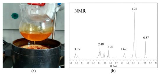 First, sulfoxide chloride dropping into lauric acid and stirring for 1–5 h at 40–80 °C. After the reaction is completed, the lauroyl chloride is obtained. Then lauroyl chloride was added to the mixed solution of water containing NaHCO3 and ether, and then ethylenediamine was dripped. Ethylenediamine bislauroyl amide was obtained by stirring for 6 h at 10–40 °C, filtering out the solid, washing and drying. Ethylenediamine bislauryl amide was mixed with phenoxyphosphatidyl diamide and reacted at 100–250 °C for 5–60 min. Then cooled and heated at 50–100 °C for 10–60 min. The insoluble substances were filtered and removed. Monocyclic imidazoline was obtained after cooling. Then monocyclic imidazoline lauric acid, 1,3-dibromopropane and triethylamine were dissolved in toluene and reacted for 10–25 h at 10–40 °C to obtain bicyclic imidazoline lauric acid. The synthesized imidazoline inhibitor was a light yellow solid. The solid product was easily soluble in water and had obvious surface activity, and the characterization with nuclear magnetic resonance (NMR) as shown in Figure 2. The NMR chemical shifts and peak area demonstrated the final product was imidazoline inhibitor, and δ (1.26; 0.87) is the hydrogen characteristic peak of long chain alkanes in imidazoline inhibitor, δ (1.26; 0.87) is the hydrogen characteristic peak of amide.