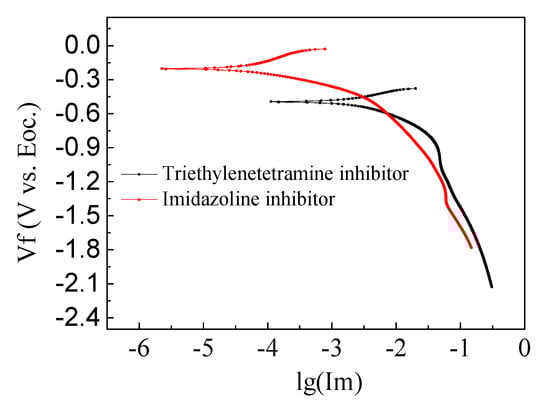 From the above table, it can be seen that, in the simulated concrete pore solution, triethylenetetramine had relatively less effect on corrosion of the steel bar. After 14 days of immersion, the maximum corrosion inhibition rate was 26.5%, which was far lower than that of the self-made bicyclic imidazoline inhibitor. Bicycloimidazoline inhibitor incurred good resistance to rust after 7 days immersion, where the corrosion inhibition rate reached 40.3%. After 14 days immersion, the corrosion inhibition rate reached 38.8%. The steel corrosion rate first increased and then decreased with extensions in soaking time. Based on the weight-loss method, self-made bicyclic imidazoline inhibitor has been determined to be more effective than triethylenetetramine, which can protect for steel bar corroded by chloride salt. As shown in Figure 4. The potential of steel bar in triethylenetetramine and imidazoline inhibitor solution is −0.50 V and −0.21 V, respectively, it also indicates the different corrosion resistance of steel bar.