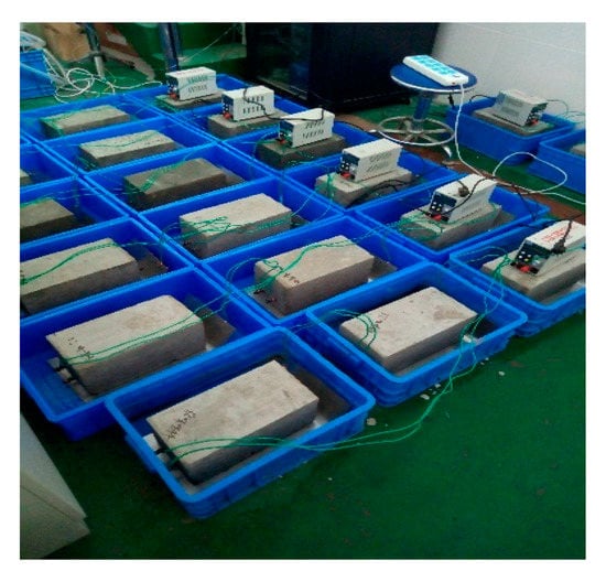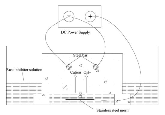 The bidirectional electromigration rehabilitation device is presented in Figure 5. The bottom of the tested concrete block was soaked in a well-dispensed inhibitor solution. By applying an electrical field between the steel bar as a cathode and a stainless steel iron plate as an anode, the chloride ions and inhibitors are able to migrate out and in the concrete cover zone [,].