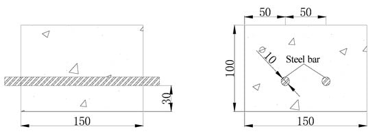 In this experiment, the strength grade of concrete is C30 which is according to engineering requirements. The dimensions of the concrete were 150 mm (length) × 150 mm (width) × 100 mm (height). Every concrete block contained two HPB235 round steel reinforcing bars with 10 mm diameters and the thickness of the concrete protection layer was 30 mm as shown in Figure 6. The concrete blocks were made by P∙O 52.5 grade cement, pebbles with diameters of 5.0–18.0 mm, medium coarse sand, and tap water. When pouring the concrete, a final concentration of 3% sodium chloride was added to the cementitious material to simulate a high chloride environment. The composition of the concrete block is presented in Table 2.