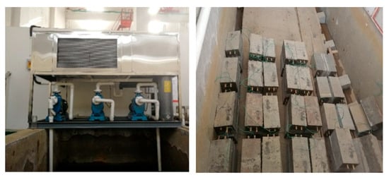 By adding 0.25%, 0.5% and 0.75% imidazoline inhibitors into C30 concrete, and BIEM is introduced during the curing period. The current density is set to 3 A/m2 and the power-on time is 15 days, and the samples were marked as Table 4. After the power-on, the dry-wet cycle test (Figure 9) was initiated at the same time. The concentration of sodium chloride in tidal simulator is 3.5%. 72 h as a cycle of drying and wetting in the experiment. In each cycle, concrete specimens were soaked for 18 h and dried for 54 h. The dry-wet cycle time of reinforced concrete specimens is 30 days.