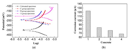 Figure 10b presents the analysis performed using reinforcement corrosion current software with the electrochemical workstation, where 1, 2, 3, and 4 represent the reinforced corrosion currents of the untreated, electrochemical chloride extraction-treated, triethylenetetramine-treated, and imidazoline-treated reinforced concrete specimens, respectively. It can be seen that the corrosion current of the untreated reinforced concrete specimens was the largest at 123 μA, while the corrosion current of the imidazoline-treated specimens was the smallest at 68.1 μA. The corrosion current of the triethylenetetramine-treated samples was 76.5 μA and the corrosion current of the electrochemical chlorination-treated samples was 83.3 μA. The corrosion current of the reinforcement reflects the corrosion rate of the steel bar under no external current. The corrosion rate is proportional to the corrosion current, where the larger the corrosion current, the faster the corrosion rate. Imidazoline and triethylenetetramine both reduced the corrosion current and slowed down the corrosion rate of the steel bar and protected the durability of the concrete structure. The corrosion current of the imidazoline was higher than that of triethylenetetramine, indicating imidazoline was more effective than triethylenetetramine.