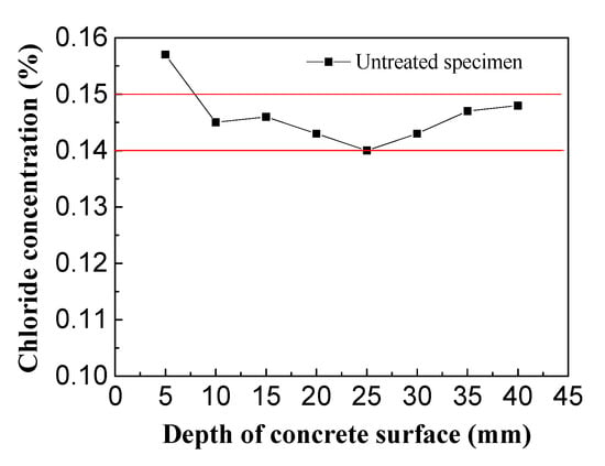 The control group consisted of concrete specimens not treated by electrochemical rehabilitation and was used to determine the initial chlorine ion concentrations in the chloride-corroded concrete (Figure 11).