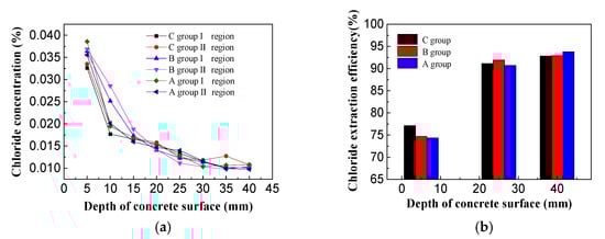 (a) Chloride concentration of concrete specimens; (b) Chloride extraction efficiency of concrete specimens.