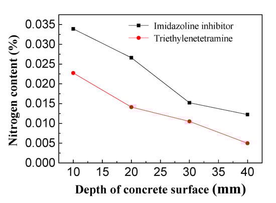 It is known that organic corrosion inhibitors are effective in preventing steel from corroding, and the concentration of the inhibitors is crucial to provide adequate protection for the reinforcement [,,]. As shown in Figure 13, the inhibitor concentration in the reinforced concrete decreased as the depth from the concrete surface increased. Specifically, the inhibitor content was highest on the surface of the concrete and lowest on the steel bar. The highest and lowest concentrations of imidazoline inhibitor in the concrete specimens were approximately 0.035% and 0.013%, and the highest and lowest content of triethylenetetramine were 0.023% and 0.005% in concrete, respectively. The amount of imidazoline inhibitor in the concrete was higher than triethylenetetramine. The surface inhibitor content in concrete was about three-fold that of triethylenetetramine and the content of reinforcing bar inhibitor was 2.6-fold that of triethylenetetramine. For triethylenetetramine and electrochemical chloride extraction, the corrosion potential and current of the concrete bar were very similar. This may be because the triethylenetetramine content on the surface of steel bar was very low and with less effective at rust protection for the reinforcing steel bar. In the experiments, the same concentration of imidazoline and triethylenetetramine were used with 0.3 mol/L, after treatment, the imidazoline inhibitor content in the concrete was higher than that of triethylenetetramine, which indicating that the imidazoline experienced stronger migration under the electric field than the triethylenetetramine.