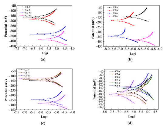 Corrosion potential of reinforcement bar. (a) 0.25% imidazoline inhibitor; (b) 0.5% imidazoline inhibitor; (c) 0.75% imidazoline inhibitor; (d) imidazoline inhibitor.
