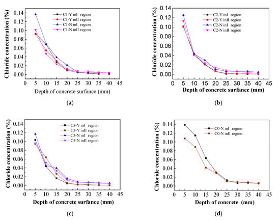 From Figure 15, in different regions of concrete specimens, it can be seen that the chloride ion concentration of concrete specimens with imidazoline inhibitor decreases along the thickness direction of the protective layer after dry-wet cycle [,]. The chloride ion concentration on the surface of concrete specimens is the highest and the chloride ion concentration on the reinforcement is the lowest. The concentration of chloride ion varies greatly from 0 to 25 mm away from the surface of concrete specimens, while the concentration of chloride ion varies slightly from 25 to 40 mm, which tends to be stable, it showed that the area of chloride ion erosion is more obvious from the surface of concrete to the area of 25 mm away from the surface of concrete [,]. The chloride ion concentration distribution trend of control specimens is the same as that of concrete specimens with imidazoline inhibitor. The chloride ion concentration of concrete surface is about 0.1%, but the chloride ion concentration of steel bar in C0-Y is higher than that of concrete specimens with imidazoline inhibitor.
