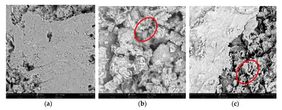Scanning electron microscope (SEM) images of different samples. (a) Reference sample; (b) electrochemical chloride extraction (ECE) treated sample; (c) imidazoline inhibitor (IM) treated sample.