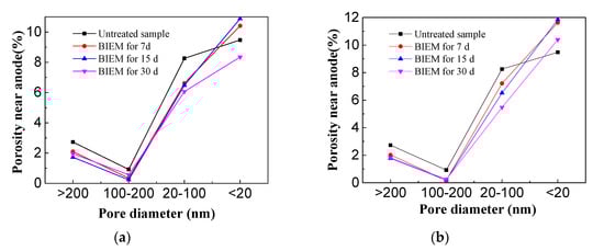 As shown in Table 5, and Figure 17, the Porosity of concrete decreased after BIEM treatment. Wu [] classified the pore diameters into the following grading (1973): Great harmful pore (>200 nm), harmful pore (100–200 nm), little harmful pore (20–100 nm), and harmless pore (<20 nm), Figure 17a,b shows the pore distributions of concretes near the anode and cathode, respectively, while the pore below 20 nm, the porosity increased with BIEM treatment for 7 days and 15 days. And the porosity of harmless pore (<20 nm) with BIEM treatment with 15 days is higher than that of 7 days, but when the charging time increases to 30 days, the porosity of harmless pore near the cathode is lower than that of 15 days, while the porosity of harmless pore near the anode is lower than that of untreated sample. The above results are due to the process of BIEM treatment, the hydration products decomposed and ions dissolved in pore of concrete cover, then pores with small diameters formed [], Furthermore, water electrolysis will generate hydrogen ions whose formation of gaseous hydrogen will cause increase in porosity near the reinforcement [,]. Thus, the porosity of the concrete is higher near the cathode than near the anode.