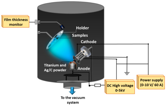 Figure 1 shows the experiment setup during Ti–Ag deposition by the TVA method. The thermoelectrons generated from the heated cathode, a tungsten filament mounted inside a Wehnelt cylinder—are focused toward the anode surface. The anode, a crucible filled with the grains of material to be evaporated, was kept at a high positive voltage. Next, the grains of materials (Ti/Ag or Ti/C in our case) were evaporated; therefore, a steady-state density of vapors was established in the interelectrodic space [15]. Applied high DC voltage of up to 5 kV between the electrodes accelerated the electrons coming from the filament and, likewise, vapors from the anode were ionized. This type of deposition ensured high-quality films with a comparatively high deposition rate due to the bombardment of the growing layer by energetic ions of the same material in vacuum conditions. Detailed TVA setup was previously reported [16,17].
