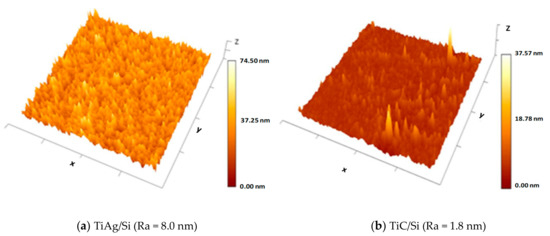 Figure 2 shows 3D AFM images of the TiAg and TiC films on the one-side polished silicon substrate. Surface morphology was different between the two samples (4 µm × 4 µm) deposited on the same substrate. In the case of TiAg/Si (Figure 2a), there were many randomly distributed peaks and valleys, while the surface of the TiC/Si (Figure 2b) was quite uniform, with only a few profile height deviations from the mean line, recorded within the evaluation length. Average roughness (Ra) was 8 nm for the as-grown 170 nm thick TiAg film, and 1.8 nm for the as-grown 120 nm thick TiC film.