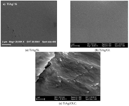 With 20,000× and 1580× enlargement, as shown in Figure 3, topography of the TiAg nanocomposites deposited on three different substrates was visible. It can be seen that the TiAg film was homogeneously and uniformly coated on the silicon (Si) plates (Figure 3a) and on glass (Figure 3b), without delamination from the substrate. The homogeneity of the coated film surface deposited on a substrate of high-quality stainless steel with 0.45% of carbon (OLC) substrate (Figure 3c) was lower than that on other substrates, but it is an inherent feature of the deposition of Ti-based coating on stainless steel.