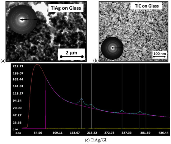 In the case of TiAg/Gl, electron diffraction showed polycrystalline material characteristics. The peaks evaluated from the profile of the SAED pattern were located as 0.231nm (111), 0.200 nm (200), 0.141 nm (220), 0.121 nm (113), and 0.114 nm (222), and indexed as cubic Ag group Fm−3m, a = 0.4080 nm [25].