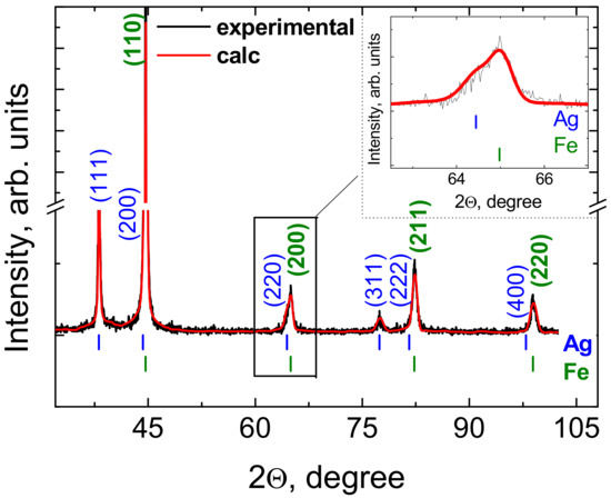 The vertical lines shown below the pattern mark revealed the expected Bragg positions of the model, as follows: upper lines mark the Ag position, and the lower lines mark the position for iron (Fe). Meanings of calculated Bragg positions and their structural compliance with the ICDD reference are shown in Table 3. The full width at half-maximum (FWHM) intensity is also presented, clearly fitting very well. No unexpected peak was present, so the sample was practically single-phase. The Fe target was crystallized into a cubic system with lattice a = 2.8661 Å. The fit was performed using the symmetry of space group Im−3m. The Ag film was crystallized into a cubic system with lattice a = 4.0833 Å at room temperature. The crystallites were oriented in the [111] direction, and mean grain size was <D>111=265 Å. The fit was performed using the symmetry of space group Fm−3m. The absence of peaks for Ti in the pattern indicated an amorphous phase.