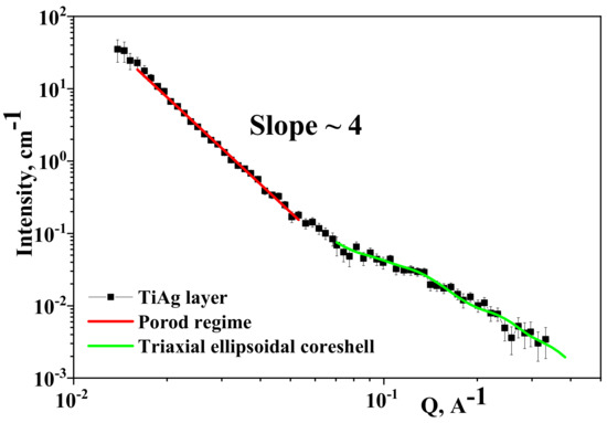 Small-angle neutron scattering (SANS) experiment curve from TiAg/OLC45 sample (black squares); linear fit of curve in 0.015 Å−1 ≤ Q ≤ 0.06 Å−1 (red line) domain using Porod approximation; model curve fittings with triaxial ellipsoidal core-shell model fit (green line) for experiment data in range of 0.06 Å−1 ≤ Q ≤ 0.4 Å−1.