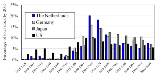 Bridges have always fascinated humanity. They symbolize links between people, communities, and nations [1]. Many bridges were built during the large infrastructural boom between the sixties and the eighties of the last century. The automotive industry has rapidly grown during this period, driving developed countries to construct many new bridges. An overview over the period from 1925 to 2004, which shows when bridges were built in the United States (US), Japan, Germany, and the Netherlands, is shown in Figure 1 [2,3,4,5].