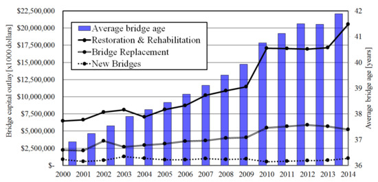 US bridges capital outlay and age (routine maintenance costs not included) [6].