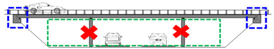 When replacing these bridges, there is a desire to have maximum freedom of space for traffic lanes. This means that spanning the total length of the existing viaduct without piers in a new bridge would be very advantageous (Figure 4, indicated with red crosses). To limit hindrance and construction time, and for economic reasons, groundwork (increasing or lowering the height of both roads) should be avoided as much as possible. However, for the new bridge, the traffic profile underneath the bridge needs to be maintained (Figure 4, green box). If the existing foundations at the abutments can be (partly) reused (Figure 4, blue box), then the requirements for an innovative, new bridge replacement concept are met.