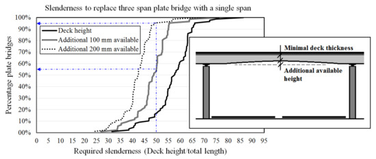 Looking at the stock of highway bridges in the Netherlands [11], a slenderness of λ = 60 (λ: span to bridge deck thickness) allows the replacement of 60% of the three-span plate bridges (Figure 5). Replacement of a concrete plate bridge of variable height by a new deck with a height equal to the minimal original deck height of the existing bridge plus an additional 100 mm or 200 mm, means that, with a slenderness of λ = 50, 52% or 95% of the bridges can be replaced, respectively [12]. Compared to the maximum slenderness of λ ≈ 30, as applied in practice with conventional (i.e., normal strength) concrete nowadays, this represents a big step. For high slenderness, but also for reasons of transportation and crane capacities, it is essential to reduce the self-weight of precast, prestressed concrete elements. Therefore, it is essential to exploit the possibilities of newly developed advanced cementitious materials (ACMs) combined with innovative building techniques.