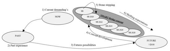 Opportunities have been identified to make the concept manageable and to achieve short-term utilization. During and after the process of developing a SMART bridge, newly identified societal challenges will be integrated and research will be carried out towards developing the next, more advanced version of the bridge. This approach makes the SMART bridge concept a fast-evolving innovation platform (Figure 6).