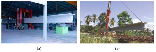 (a) Full-scale destructive test on a 30 m long segmental T-beam, research done in 2007–2010 [14,15]; (b) construction of 30-m-span Ulu Chemor bridge, stitched T-girder construction [15].