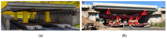 (a) Illustration of placing a new bridge deck with the use of an SPMT (computer-controlled platform vehicles) with jack-ups [19]; (b) placing a bridge with an SPMT during the replacement project, I-84 bridges over Marion Avenue in Southington, US [20].