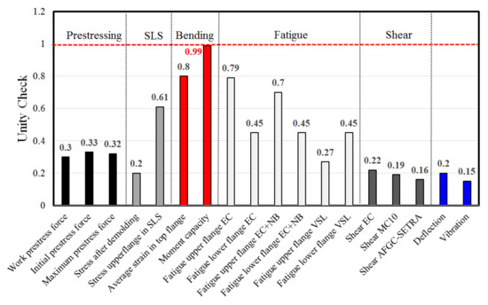 Figure 9 shows the results of the calculations. For a chosen bridge span of 33 m, with a height of 0.9 m and prestressing strands of 15.7 mm, the optimum solution for the box girder cross-section and the prestressing configuration was determined. The obtained values show the results of all relevant design checks for the unity check. From the performed calculations, it could be seen that the moment capacity was governing, whereas the SLS criteria (e.g., stresses in service and deflection) were not critical. Note that, although generally being considered in the current approach (i.e., based on certain assumptions), for further development of the concept detailed attention has to be given to issues like dynamic response and the creep behavior of slender UHPC prestressed girders.