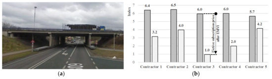 In the described tender procedure, the criteria for choosing the best contractor were directly related to the earned EMVI. Figure 10b shows the results of the tender for the evaluation of five contractors. The dark gray column represents the subscription price ranging from 5.7 to 6.5 (indexed). Subsequently, the fictive subscription price was calculated based on the EMVI. The white columns, ranging from 1.0 to 4.2, were the fictive subscription prices. The EMVI has a very large influence on the final result, meaning that traffic impact and infrastructure alignment were very important factors in this tender. Contractor 3 won the tender with the lowest fictive price of 1 (indexed).