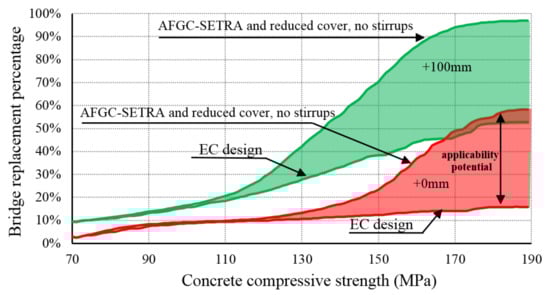 In Figure 16 (indicated by red color) it is shown that by designing with UHPC, according to the AFGC-SETRA recommendation [21], applying a reduced cover and taking into account fiber reinforcement and no stirrups, instead of requirements given by EC, the potential application area for bridge replacement increases from 16% to 58% when the height is kept equal to that of the existing plate bridge. The percentage increases from 52% to 96% when an additional height of 100 mm is available (indicated by green color). Since it concerns the application outside the codes, as done in Malaysia [14,15], prior full-scale testing would have to play a major role in demonstrating the structural capacity for short-term behavior. Meanwhile, monitoring, as applied in Switzerland [17], would contribute to the control of long-term structural behavior.