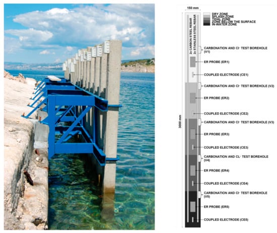 The main aim of our long-term research was to evaluate two relatively new measuring techniques for the corrosion monitoring of steel in concrete at different heights at the coast. It was believed that specific corrosion processes, which are related predominantly to macrocell corrosion due to individual exposure conditions at specific heights (in-water, below the water level, tide, splash, and dry area), could be detected. Namely, due to the different concentrations of anions and oxygen, a particular distribution of anodic and cathodic sites can be expected. The electrical conductivity between these sites due to the presence of water certainly plays a significant role in their distribution. It should be mentioned that due to the tide and splashes this distribution is changing. It was expected that the measuring techniques (ER probes and CMEs) could also provide some relevant information about the eventual corrosion initiation on stainless steel in concrete. It was found that a distinct part of the obtained results was in agreement with our expectations, but specific questions that need further discussion and investigations were also indicated.