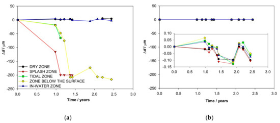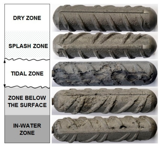The ER probes measure the metal’s thickness reduction due to corrosion, so it is not an electrochemical but a physical method. Based on its performance characteristics, it is possible to determine the cumulative corrosion damage, as well as the corrosion rate in specific periods. It was found in our previous research that the first part of the thickness reduction results predominantly reflects general corrosion, but afterward (more than 20% of the reduction) localized corrosion could also be detected [28,30,34]. The highest corrosion rates using the ER probes were measured in the splash and tidal zones, whereas the corrosion rates in the zone below the surface were slightly lower. Since localized corrosion rates on rebars are usually considerably higher than the general corrosion rate, it can be concluded that in the faster increase of corrosion rates obtained by the ER probes actually both types our corrosion were measured. Negligible corrosion rates were measured in the dry and in-water zones.