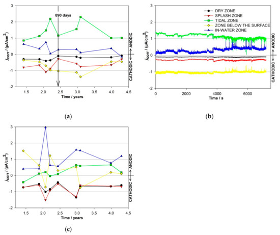 The anodic and cathodic currents were also measured in the different exposure zones by coupled multi-electrodes, which were placed in four concrete columns, one in each zone of exposure. During each 1–2-h-long measurement, current fluctuations were monitored on the individual electrodes (Figure 4b). At the time of one measurement, the currents on the individual electrode never changed between the anodic and cathodic positions. In order to follow the shifts of the anodic and cathodic sites between the different zones of exposure during the entire time of exposure, each measurement was averaged and presented as a function of time (Figure 4a).