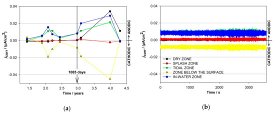 (a) Average values of the partial currents and (b) individual measurements of the partial currents after 1085 days of exposure on stainless steel-coupled multi-electrodes exposed to different zones of exposure in column C10.