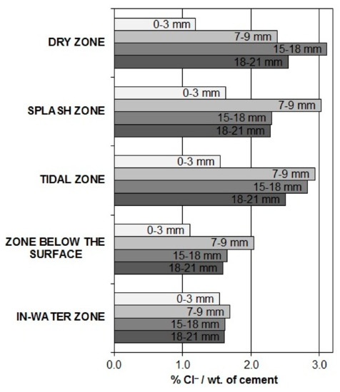 In all the zones of exposure, the lowest contents of Cl− (Figure 8) were found close to the surface of the concrete (0–3 mm deep), where the chlorides can be washed out. In general, the highest contents of Cl− were detected at a concrete depth between 7 mm and 9 mm. At this depth, the Cl− content is the highest in all the zones of exposure, except in the dry zone, where the highest Cl− content was found to be deeper (between 15 mm and 18 mm). On average, the highest Cl− content was found in the tidal zone, although the highest Cl− content at the level of the steel reinforcement and probes was detected in the tidal zone and the dry zone. The splash zone followed with just a slightly lower percentage. These zones were exposed to the harshest environmental conditions (e.g., strong winds, heavy rain, constant wetting, and drying, etc.) that can penetrate chlorides deeper into the concrete [42]. The lowest Cl− content in general and also in the depth of the steel reinforcement was measured just below the water surface and in the in-water zone, where the distribution of Cl− at different depths is very uniform. This indicates very stationary conditions concerning the diffusion of chlorides through the concrete.